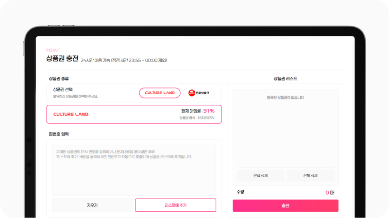 보유하신 상품권의 핀번호를 입력하고 리스트에 추가 버튼을 누른 후,